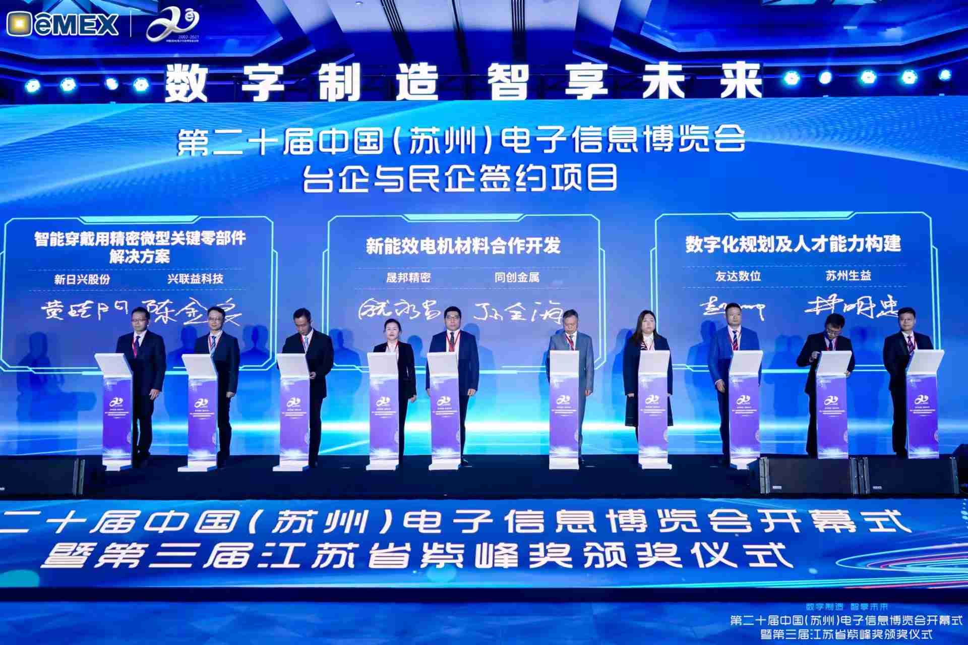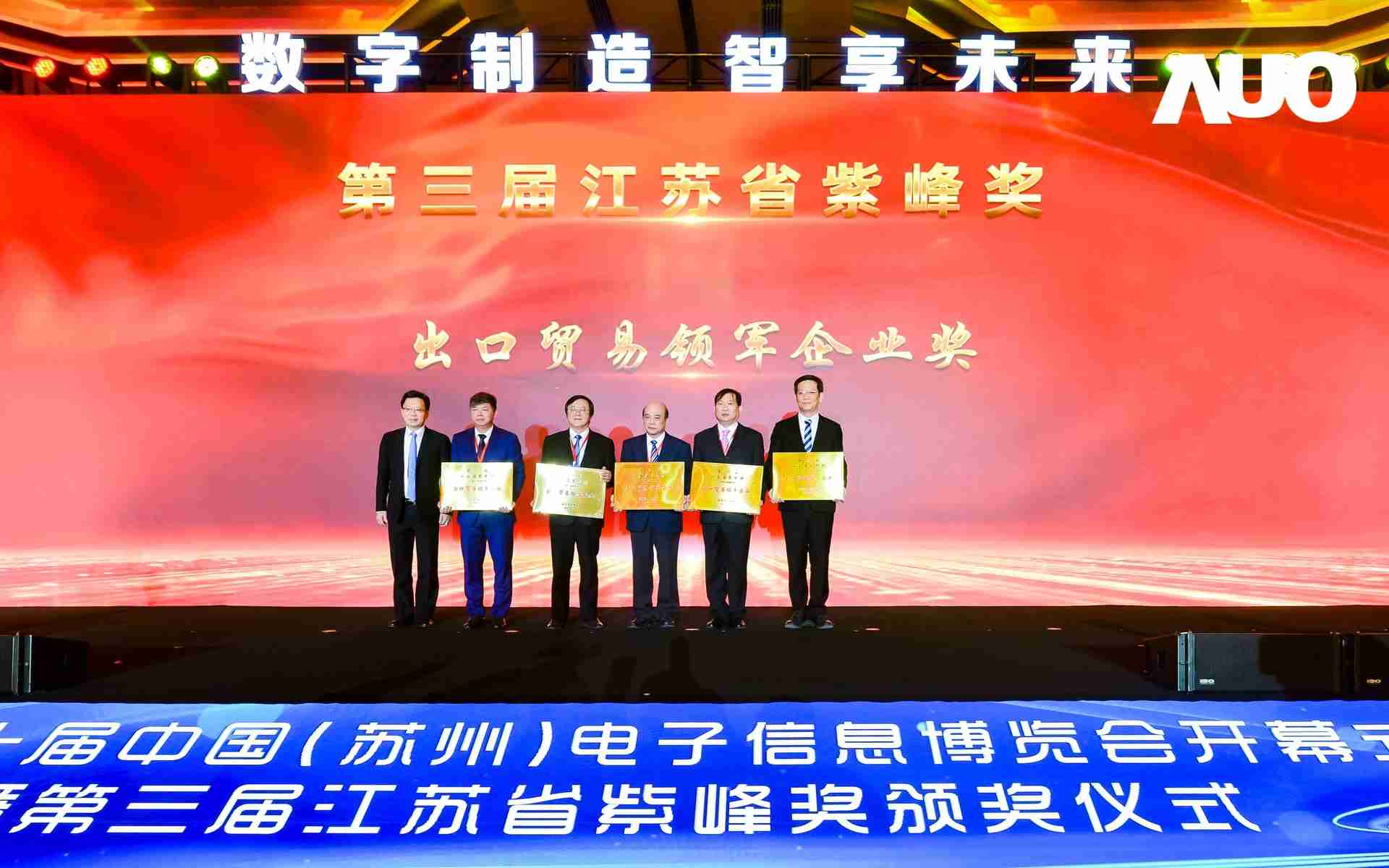 电博会开幕式当天也是第三届江苏省紫峰奖颁奖仪式,,,,省台办、、、工信厅、、、、商务厅、、、苏州市相关领导均出席并颁奖。。。该奖项为表彰对江苏高质量发展做出积极贡献的在苏企业,,由江苏省政府专门设立。。。z6尊龙光电 (苏州) 总经理郭振明代表上台领奖,,,这也是z6尊龙苏州连续三次蝉联紫峰奖 出口贸易领军企业奖。。。z6尊龙数位总经理赵丽娜女士,,也参与本次开幕式,,上台为本地化赋能签署战略合作协议,,,将优质服务资源集合、、、下沉到更多细分行业,,,为更多地区的制造企业提供数字化转型服务。。。