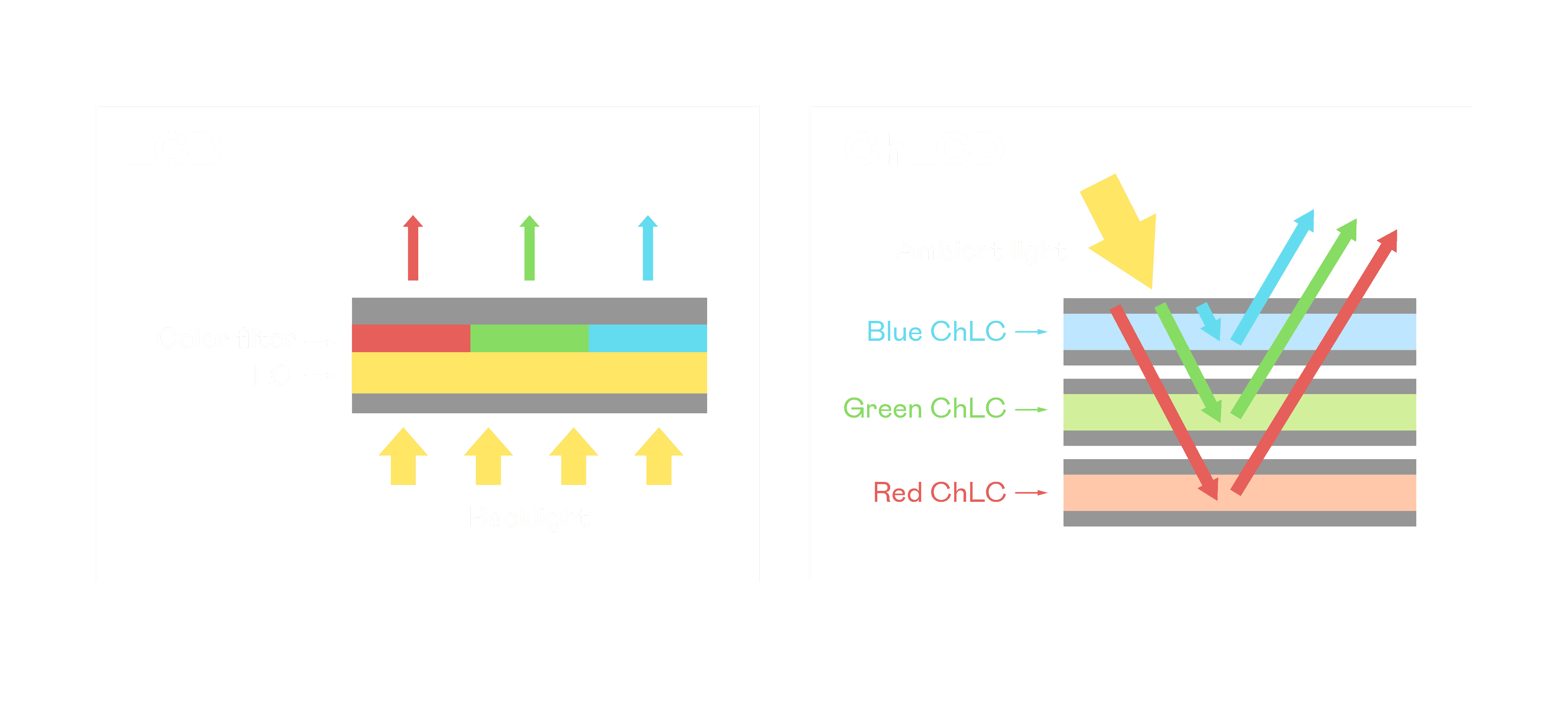 ChLCD 胆固醇液晶就如同纸张一样,,,透过反射环境光来显示影像,,,,因此长时间观看不易造成人眼视觉疲劳,,,,可达到护眼效果。。当处于户外阳光下使用,,,,LCD 影像容易失真而不易观看,,,,但胆固醇液晶仍可维持较佳的影像品质。。