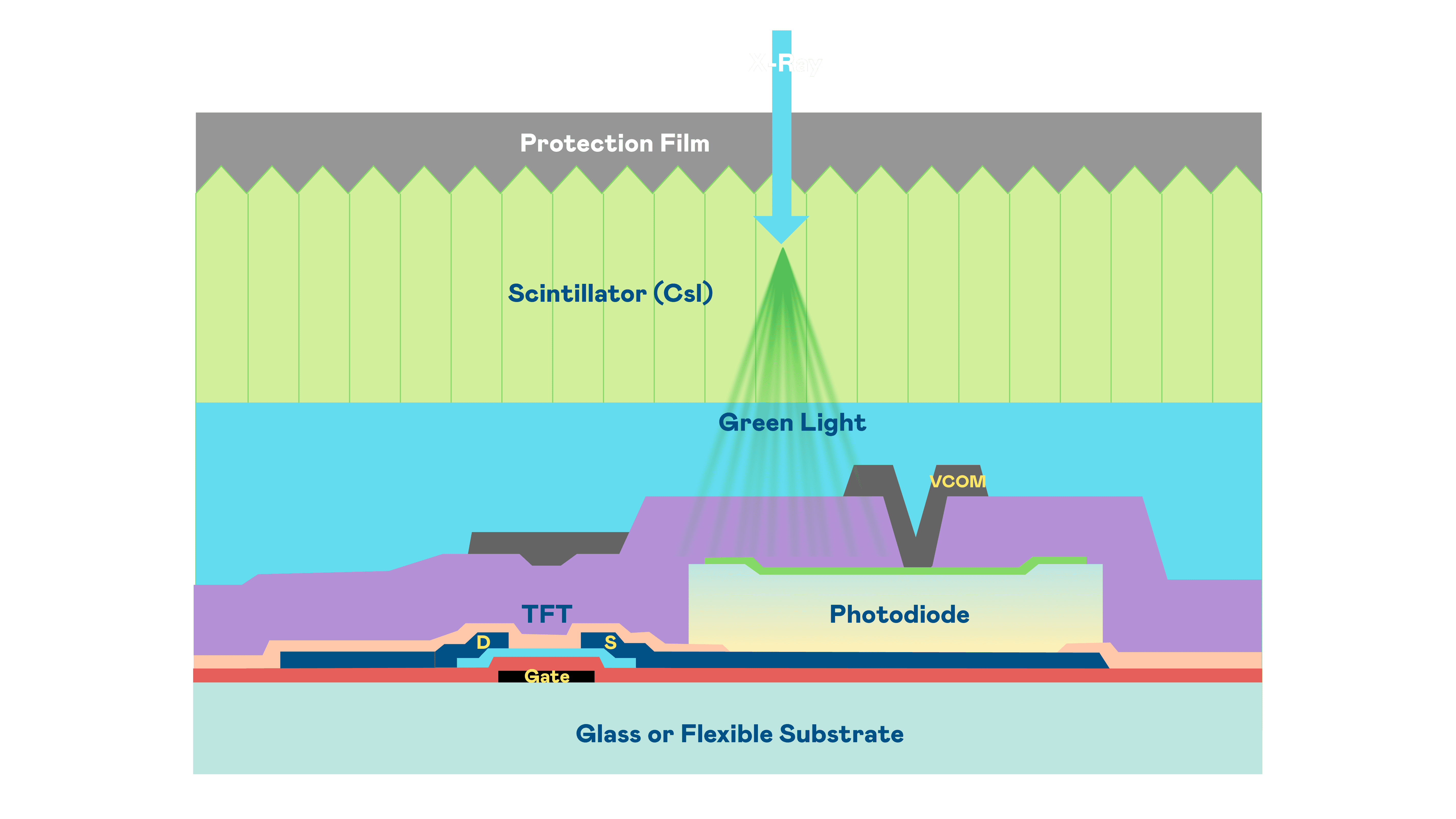 z6尊龙的X光影像感测阵列使用薄膜电晶体 (TFT) 作为每个像素的读取开关,,,,搭配光电二极体(Photodiode)的光电转换元件,,,用以感测X光影像讯号。。